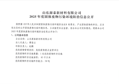 山東源泰新材料有限公司2025年度固體廢物污染環(huán)境防治信息公開
